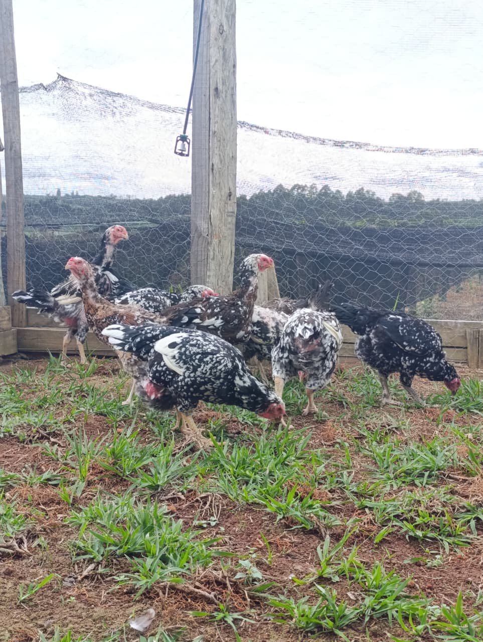 A baia destinada ao Índio Gigante Pintado é planejada para oferecer espaço, conforto e segurança às aves. O ambiente amplo favorece o desenvolvimento saudável dessa variedade de grande porte.